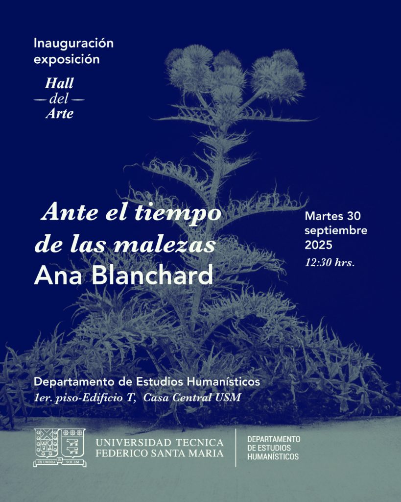 El Departamento de Estudios Humanísticos de la Universidad Técnica Federico Santa María, a través de su Área de Artes, invitan cordialmente a toda la comunidad USM a la inauguración de la exposición Ante el tiempo de las malezas de la artista visual Ana Blanchard.